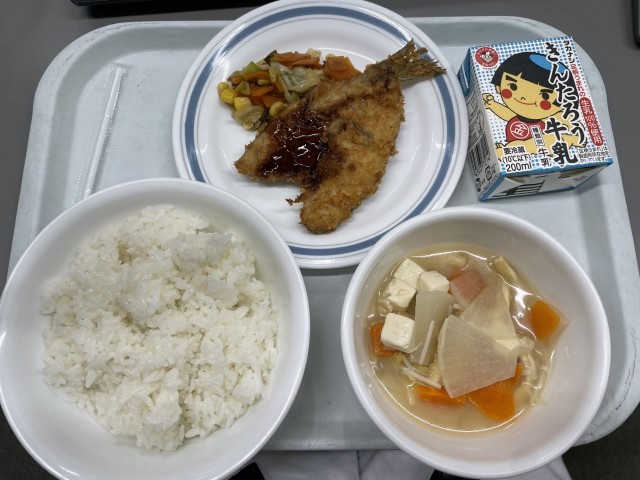 【献立】牛乳 ごはん カマスのフライ キャベツの塩昆布炒め 煮干しだしの味噌汁