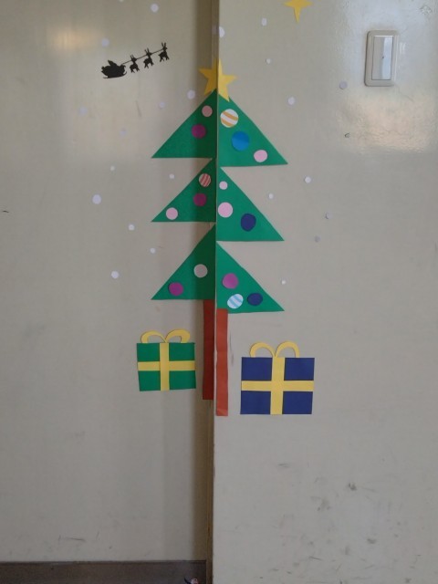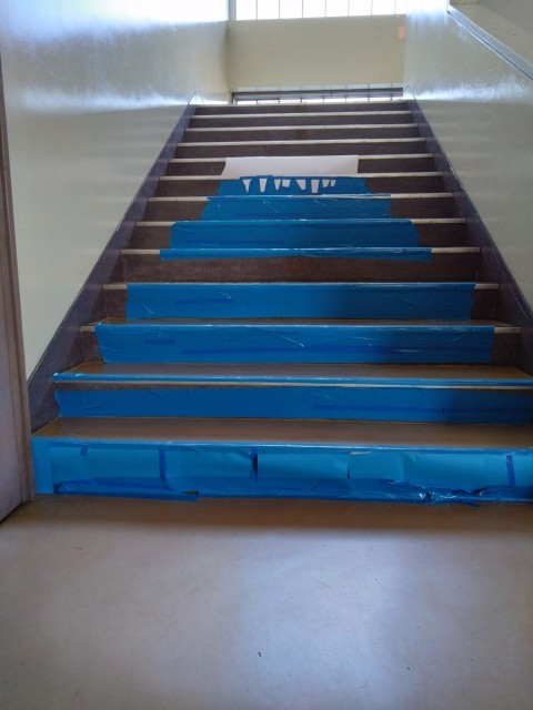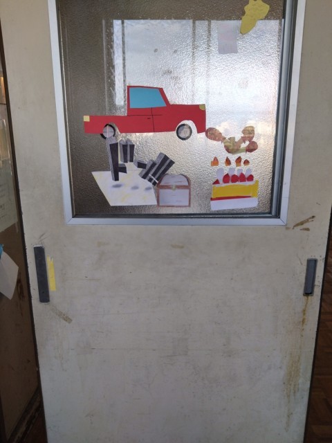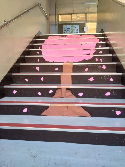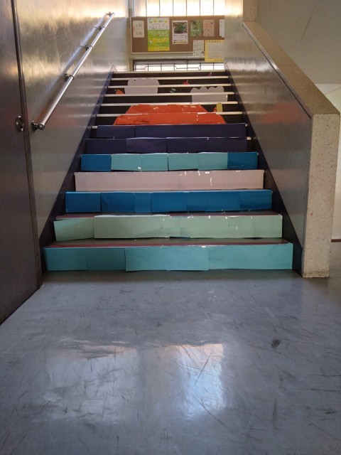 階段や柱の角の段差を生かしたり、窓や扉の引き具合を生かしてたりして、作品が完成するようになっており、それぞれの場所を生かした作品がたくさん展開されています。ふれあい班を基本としたグループで協力して、仕上げました。「ここから見るといいよ」という足の位置も指定されており、バラバラに見えていたものがそこから見たときにぴったりと重なって一つの絵が浮かび上がる様はとてもすてきです。