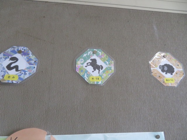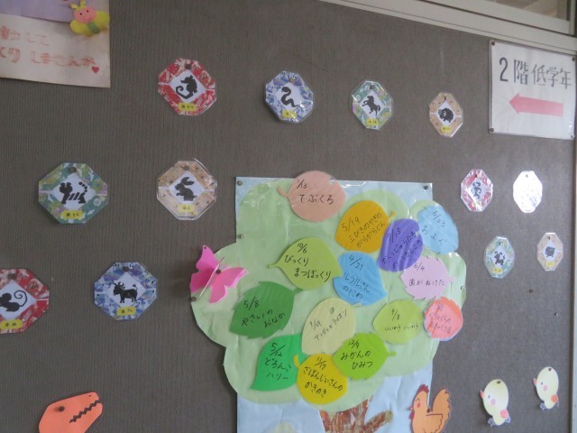 今日は新しい年を迎えたことから、十二支が貼られていました。1年生の読み聞かせのお話にちなんでのことでしょう。「1年生でも十二支をちゃんと言える子がいましたよ。」と掲示しながらうれしそうにお話しくださいました。その方のお手製の飾りで、とても素敵に飾られています。