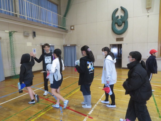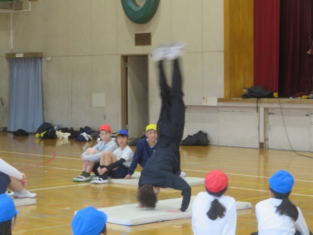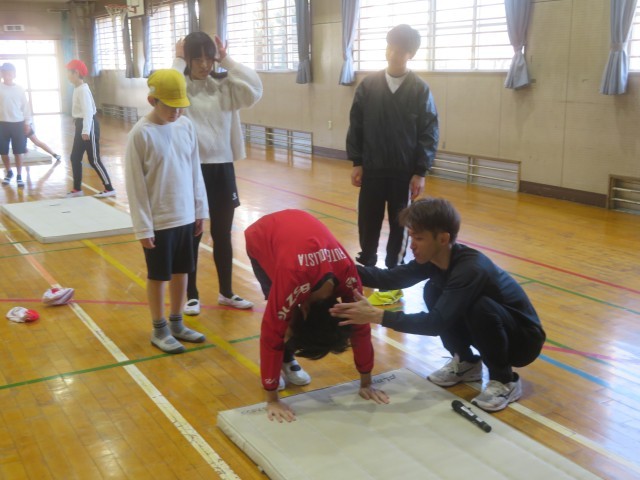 その後、マット運動がは始まりました。前転や後転、開脚前転や側転など先生のお手本がどれも見事で、拍手が起こりました。それぞれの場所で練習を始めると、子どもたちは一生懸命に技の練習に取り組んでいました。先生から回り方のアドバイスを受けたり、うまくいかないときでも、「ここの手の付き方がいいね。」などの声かけがあったりで、あっという間に時間が過ぎていったようです。