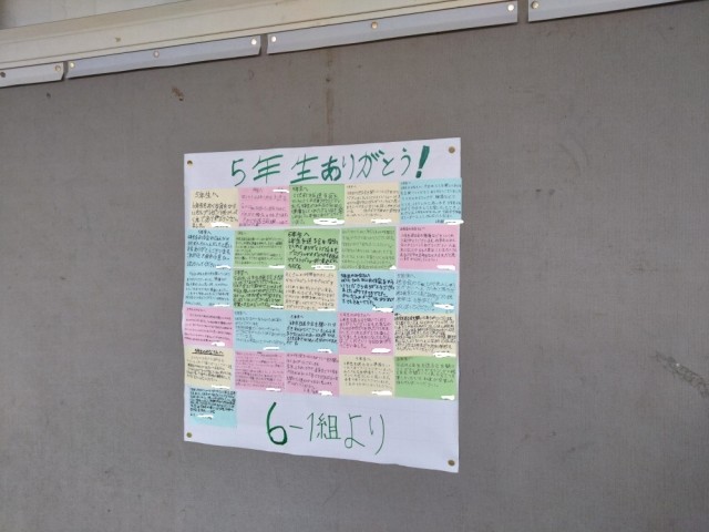 5年生の廊下を通ると、メッセージが貼り出されていました。6年生から5年生に向けた感謝のメッセージです。