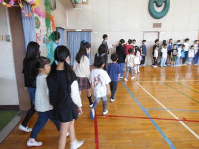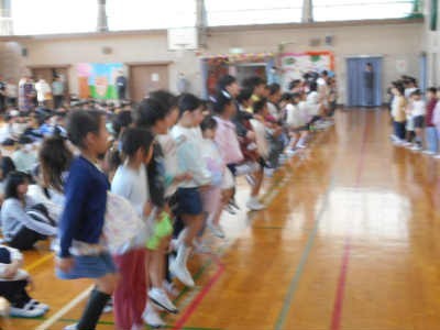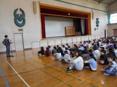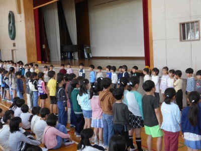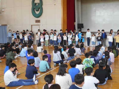 全校児童が体育館に集まり、改めて顔を合わせる「対面朝会(対面式)」が行われました。