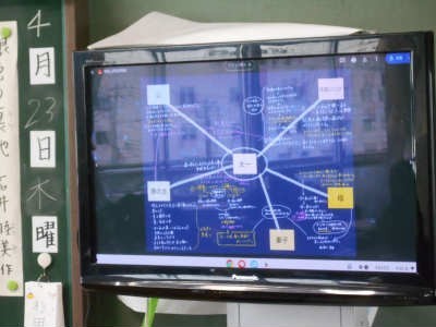 また、担任は昨年度6年生を担任した際に扱った教材「海の命」で用いた人物関係図の見本を画面に映し、活動が苦手な子にもイメージが湧きやすいように支援していました。