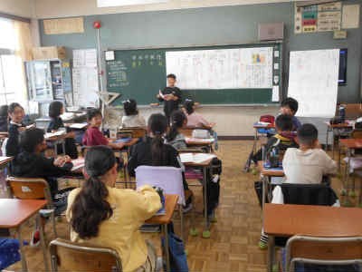 5年生の教室に入ると、ちょうど「自分の名前で自己紹介」の発表が終わるところでした。