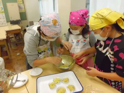 今日は、秋の味覚”さつまいも”を使ったスイートポテトに挑戦しました。ほくほくに蒸したさつまいもに砂糖、牛乳、たまごを混ぜて、お好みの形にしてオーブントースターで焼きました。ごつごつした皮をむくのはちょっと大変でしたが、おいしいできあがりに大満足。みんなにこにこ笑顔でいただきました。