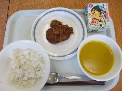 麦ごはん 牛乳 ハンバーグきのこソース パンプキンスープ