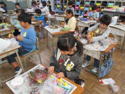 4月から育てたあさがおのつるを活用して、素敵な作品ができました。「楽しかった。」と子どもたちは、大満足の作品が作れたようです。