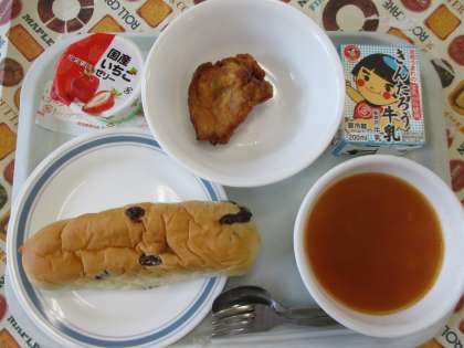 ぶどうパン  牛乳  フライドチキン  お豆のトマトスープ いちごゼリー