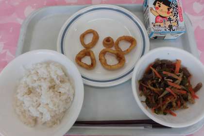 今日のいかは四角い切り身ではなく、いかリングにしてみました。カレー粉をまぶし衣で揚げた更紗揚げは子どもたちにも人気があります。こんにゃくのきんぴらにも根菜類がたくさん使われています。どちらもよくかむかみかみ食品のメニューです。しっかりかんで味わいながら食べてくださいね。 (中学年 619Kcal)