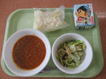 子どもたちの大好きなミートソースには、相性がいいパスタの平めんを組み合わせました。めんがからみやすく、おいしく味わって食べられます。きゃべつのソテーも仕上げのごまが風味よく仕上がりました。野菜が苦手な子も残さずに食べられるといいですね。