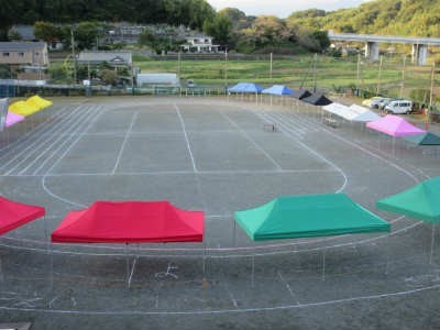 校庭には色とりどりのテントが並び、まるで花が咲いたような華やかさです。