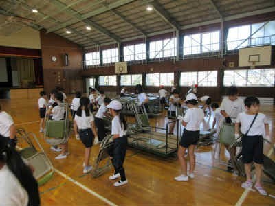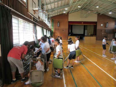 4時間目には、5年生が体育館からパイプ椅子を運び出す作業を行っていました。