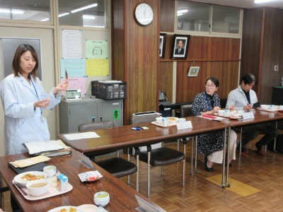 試食の時間には、橘共同調理場の栄養士による献立の説明があり、小田原市の調理場でこだわっている「だし」についての話も伺いました。
