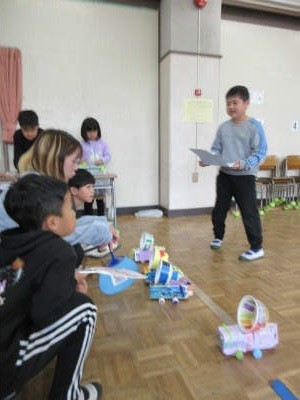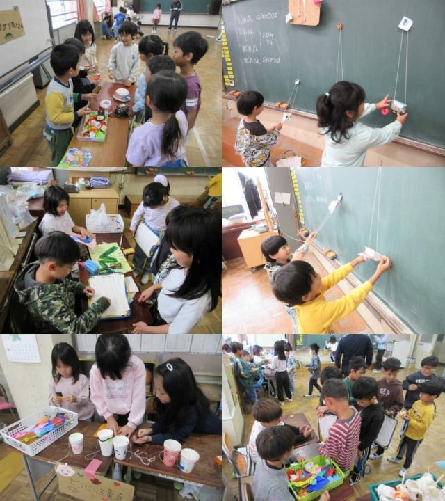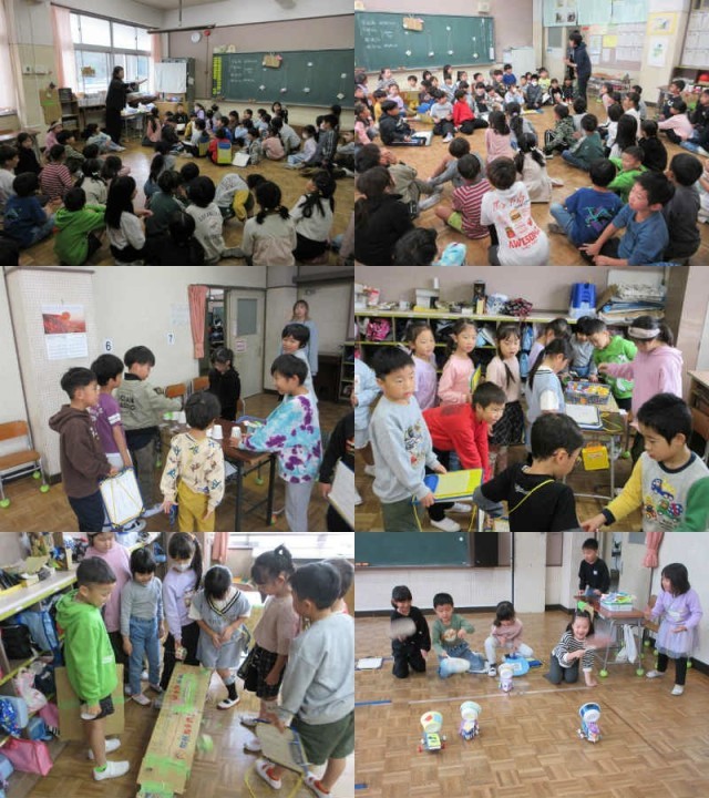 主として手作りの動くおもちゃを使って、1年生と一緒に遊びながら、楽しい時間を過ごしました。