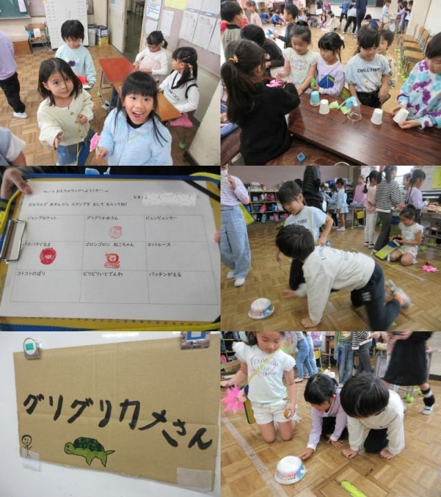 「紙コップロケット」や「コトコトのぼり」など、他にも工夫されたおもちゃが並び、1年生はスタンプカードを持って、いろいろなブースをまわります。