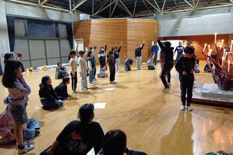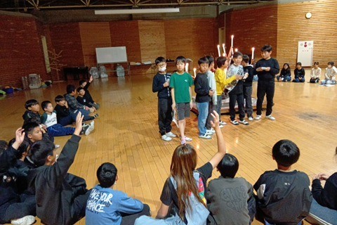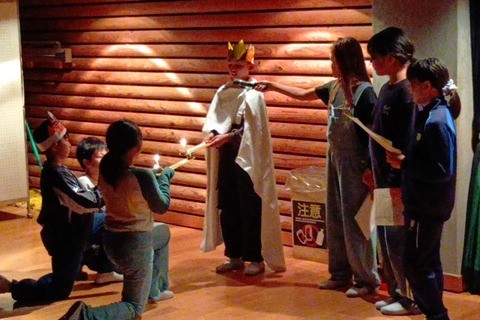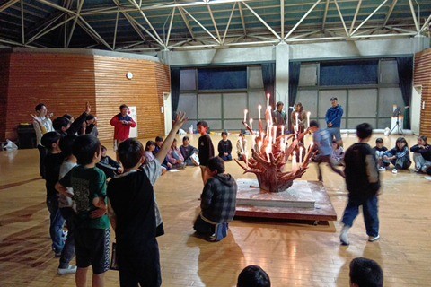 火の神によるキャンドルへの点火のあと、各班からの出し物を楽しんでいます。