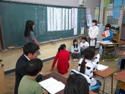 まずは5時間目、基本的には全ての教員が4年2組の教室に集まり、国語科「役割を意識しながら話し合おう」の授業を参観・観察しました。