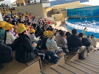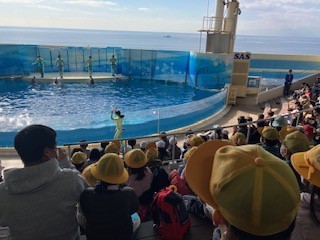 水しぶきがキラキラと舞う中、子どもたちはイルカショーに夢中!