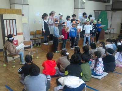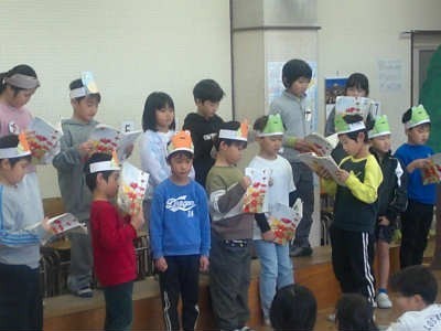2年生は国語の教科書教材「お手紙」の音読を1年生に発表しました。