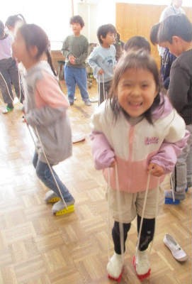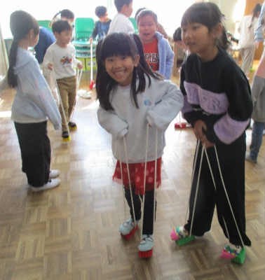 いくつか学校にあるものをやってみようということで、ぽっくり、お手玉、けん玉などを全員で体験しました。
