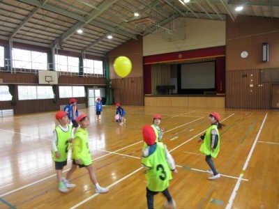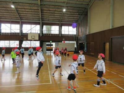 2年生は体育館で「風船バレーボール」に取り組みました。