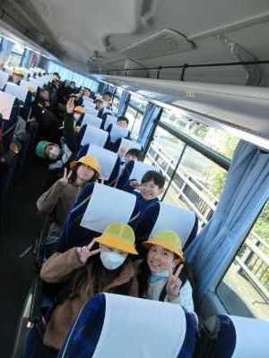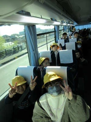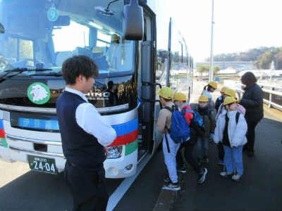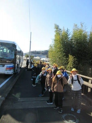 4年生は学校から歩いて7分ほどの「段ボール工場」の少し先にある広い道路に到着し、9時10分、待っていた貸切バスに乗り込みました。