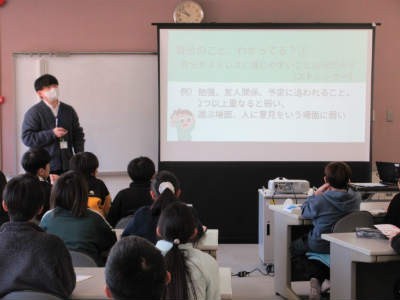 途中には、近くの友達同士や小グループで話し合う場面もあり、「どんなときにストレスや不安を感じるか」「気持ちを落ち着かせるために普段していること」などを、穏やかな雰囲気で伝え合う姿が見られました。