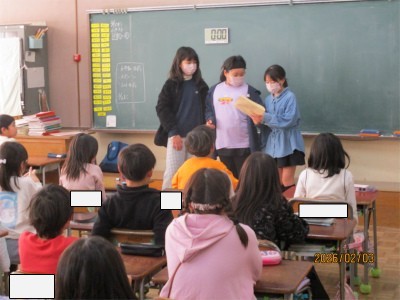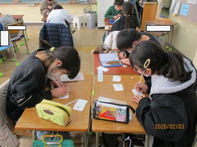 ですが、2月2日(月)の記事にもあるように、現在発熱や体調不良等によりお休みをする児童も増えていることから、各教室で寄せ書き用の紙にメッセージを書く活動に急遽変更となりました。