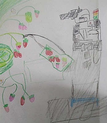 ◎イチゴ摘み取りロボット・・・センサーで熟して赤くなったイチゴだけを摘み取ることができます。人手が足りない時にも活躍します。