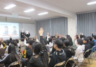 保護者の方が説明を受けている間、子どもたちは、生徒会の先輩方からクイズ形式で橘中学校のことを色々と教えていただきました。