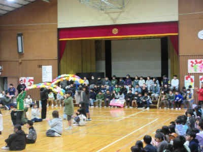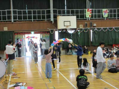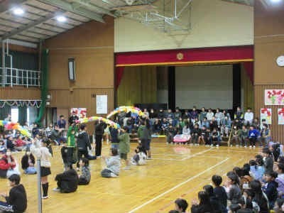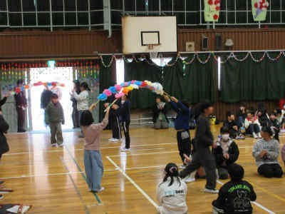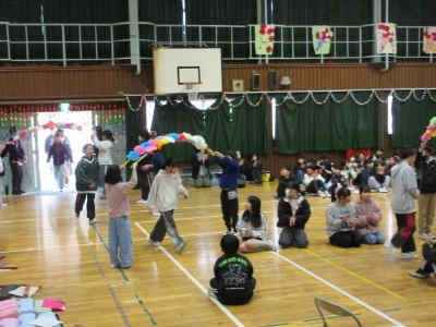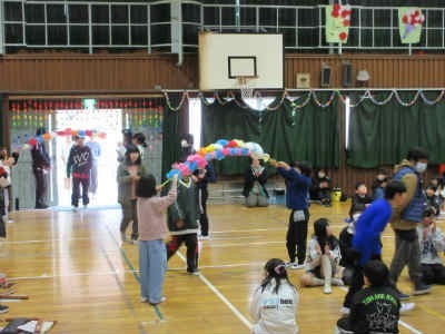 全校児童 6年生を送る会 その2 花のアーチをくぐって6年生入場