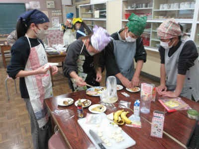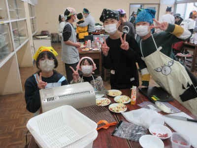 各グループでは、クレープやピザなど、自分たちで考えたメニューに取り組んでいました。