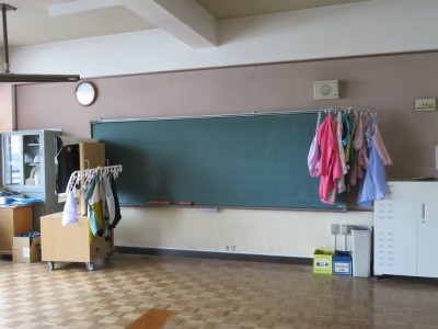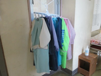 教室を回ってみると、どの学年も、教室や廊下には、濡れてしまった服やレインコートが干してありました。(*1、2枚目の写真)