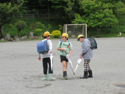 4枚目の写真は、下校時の様子です。傘と長靴の姿ですが、帰りはみんな軽やかに帰っていきました。