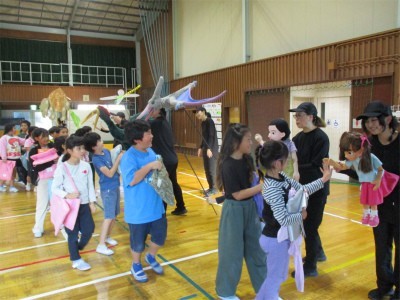 劇の途中、様々な恐竜が登場して会場を盛り上げましたが、4年生が実際に生み出した「シモタマサウルス」が登場すると、ひと際大きな歓声があがっていました。
