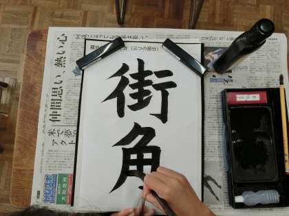 夏休み前に「湖」という字を書くことをとおして「三つの部分の組み立て方」を学びましたが、その学習を思い出しながら、「街角」という字を書く練習をしました。