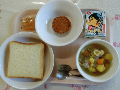 牛乳 食パン りんごジャム キャベツメンチカツ 旬野菜ポトフ