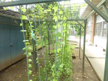 理科の授業で5月にヘチマの種を植えて、その成長を観察してきました。ある程度大きく育ってからは4年生の花壇に植え替え、係りの子ども達が放課後水をあげて大切に育ててきました。先日の荒天が回復し時折晴れ間も見える今日、ヘチマに花が咲いていました!まだ数少ないですが黄色いきれいな花を咲かせており、秋には立派なヘチマを収穫するのが楽しみです。