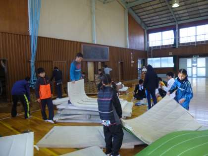 体育委員会は朝の委員会の時間に、ボールの空気入れと体育館のマットと跳び箱の整理をしました。必死に空気入れをしたり、重たいマットや跳び箱を声をかけ合って楽しそうに動かしたりしていました。