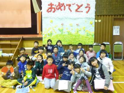 「6年生を送る会」に向けて、休み時間も使って、体育館の壁飾作りと4年生の出し物である劇、歌の練習に励んできました。