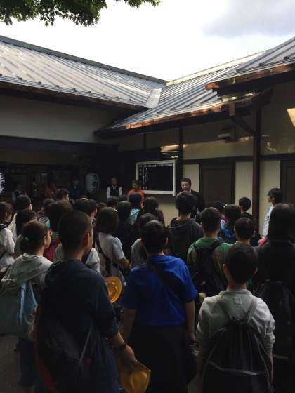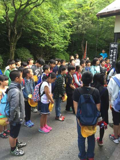 いよいよ旅館に到着し、旅館到着の会をしている様子です。歩いているときは「疲れた・・・」と言っていた子どもたちも、旅館を前にまた楽しい時間が待っているのでは?という期待を膨らませている様子が見られます。旅館の方にもきちんと挨拶をし、楽しい一夜を過ごしたいと思います。