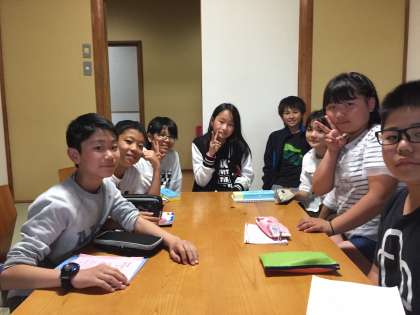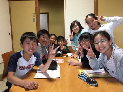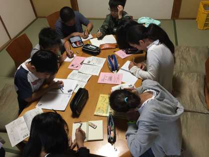 写真は班長、副班長会議の様子です。班長には金銭の管理の仕方と水筒の対応、副班長には避難経路の説明、どちらもとても大切な指示を出し、宿泊グループのみんなに連絡してもらいます。部屋では・・・1日目の振り返りをしている子どもたち!事後学習のパンフレット作りに活かせるようがんばっています。