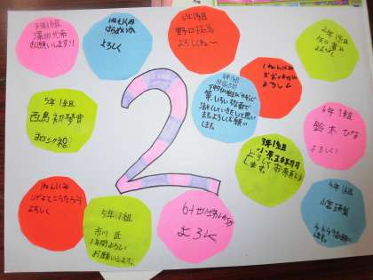 まずは、班のカード作りをしました。6年生が見本を見せながら指示を出し、1年生を中心に面倒を見てあげていました。数字を6年生が工夫して描いていたので、みんなの名前を貼るととても明るい班のカードが完成しました。