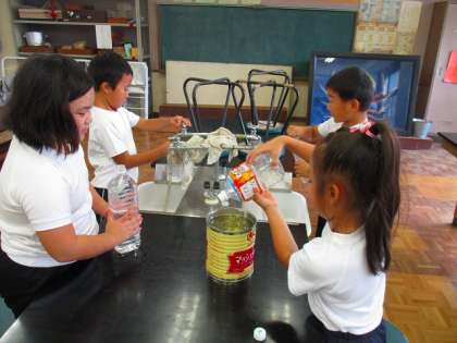 最初は大きな缶の中にペットボトル何杯分の水が入るかを実験しました。結果は班ごとにばらばらでした。「なんでだろう?」と問いかけると「ペットボトルの大きさが違うから!」と答えが返ってきました。その後はペットボトルの大きさを同じにしたり1リットル枡を使ったりして同じように実験しました。