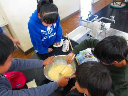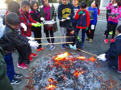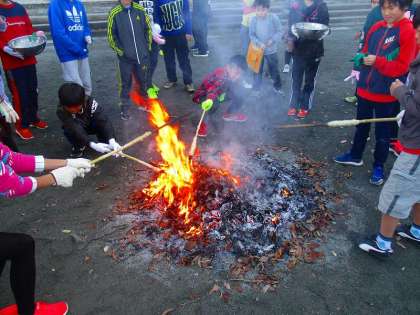 生地を作り、外のたき火で焼きました。焦げすぎたり、生焼けだったりと加減が難しかったですが、グループに分かれて頑張っていました。始めは上手くいきませんでしたが、途中から上手く巻くことができました。