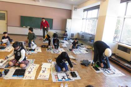毛筆で、書き初めの練習をしました。初めて多目的室で練習を行い、広々とした状態で練習することが出来たようです。3年生は、