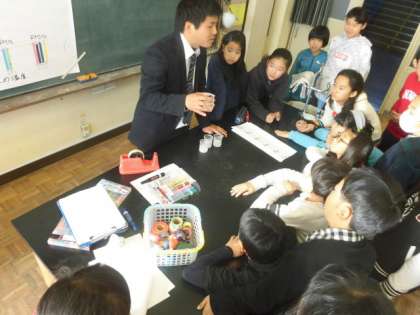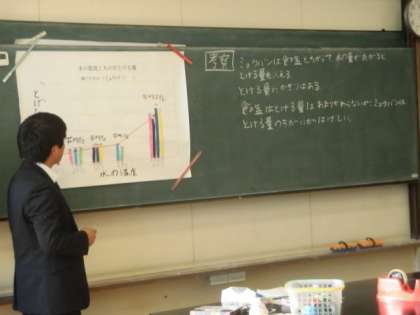 本校は今年度も「学び合い、高め合う子の育成」を研究主題とし、生活科・理科を窓口に職員の研修を進めています。今日は今年度最後の5年2組での授業研究を行いました。単元は「もののとけ方」で、温度を変化させてミョウバンを水に溶かし、前に学習した塩の溶け方との違いを学習していく授業でした。溶ける量の変化を視覚的に捉えられるように紙テープを使ったグラフを作成し、考察を考えるのに役立てるようにしました。目で見て理解しやすいグラフがあったおかげで、子どもたちは自分なりの考察を考えることができました。