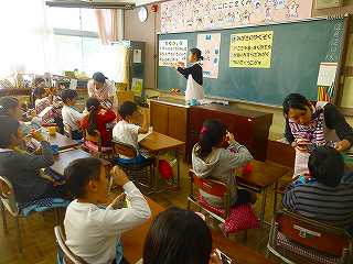 まず、紙芝居で歯についてわかりやすく説明をしたあと、模型を使い ながら歯磨きの仕方を丁寧に教えてくださいました。