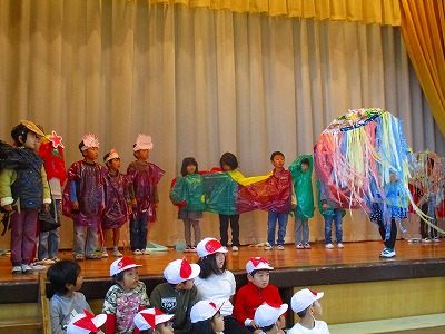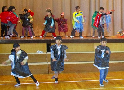 今度は図工グループの練習風景です。自分の衣装と台詞、立ち位置とたくさんのことを覚えなくてはならない中、しっかり覚えることができました。図工で行ったハロウィンの衣装を作ったときのことを生かし、工夫して衣装を作ることができました。