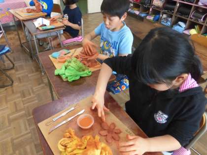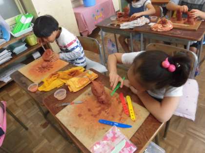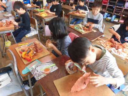 図工の授業では、土粘土を使った作品を作りました。まずはしっかりと粘土を捏ねてから取り組みました。ヘラを使いながら、思い思いの作品を作り上げました。